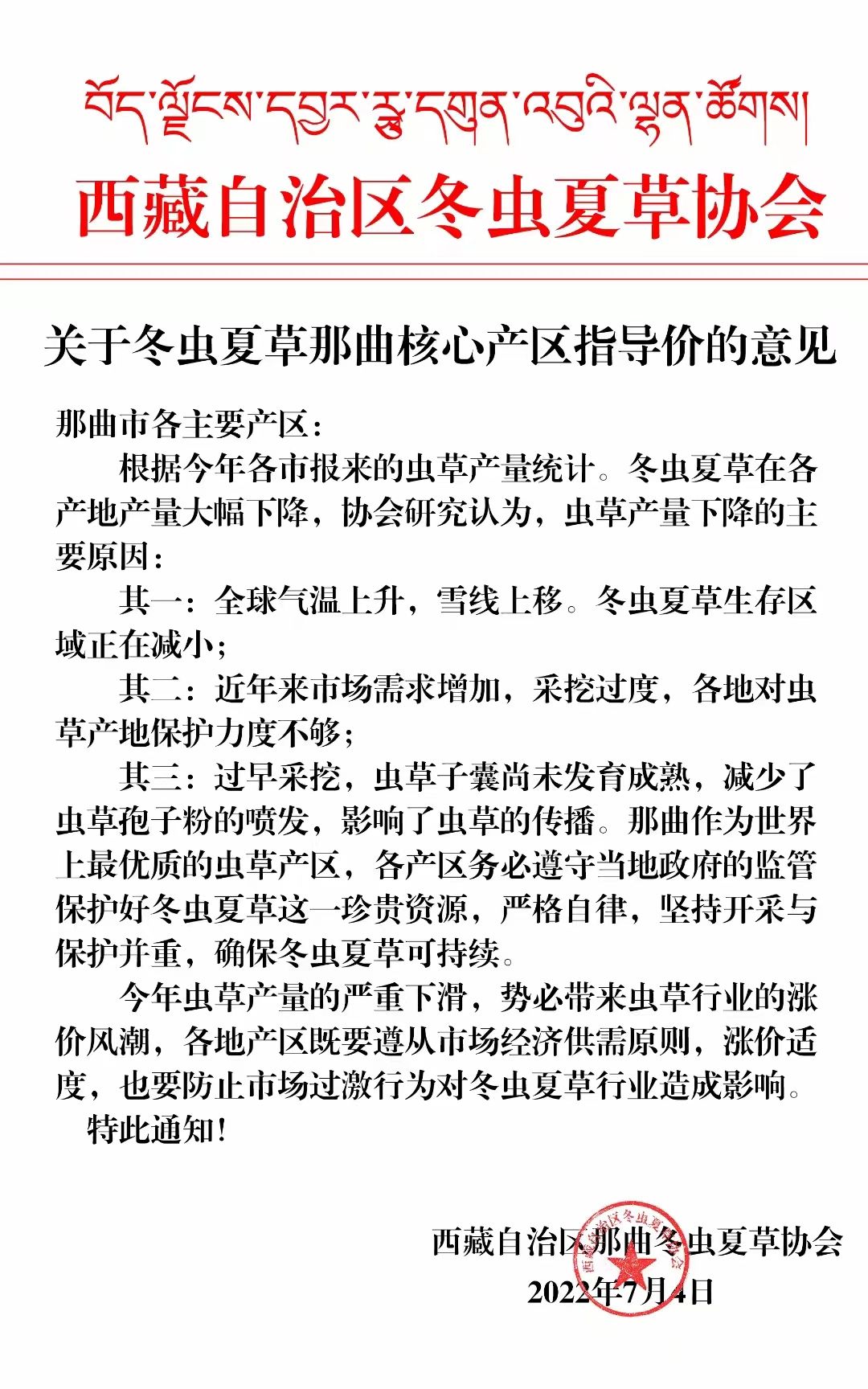 那曲作為世界上最優(yōu)質的蟲草產區(qū),各產區(qū)務必遵守當?shù)卣谋O(jiān)管保護好冬蟲夏草這一珍貴資源,嚴格自律,堅持開采與保護并重,確保冬蟲夏草可持續(xù)。今年蟲草產量的嚴貢下滑,勢必帶來蟲草行業(yè)的漲價風潮,各地產區(qū)既要遵從市場經濟供需原則,漲價適度,也要防止市場過激行為對冬蟲夏草行業(yè)造成影響。特此通知!