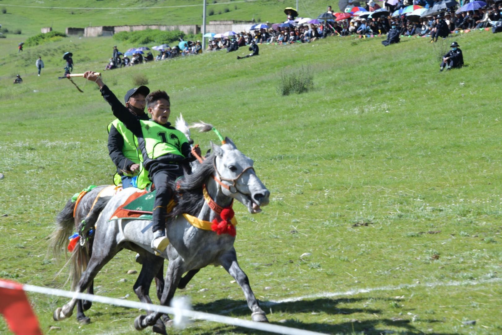 27日上午,在比如縣茶曲鄉(xiāng)措姆頂舉行場面熱烈、令人激情振奮的“走馬預賽”活動,只見賽馬場上,娜秀男兒身著節(jié)日盛裝,腳跨高大駿馬,在草原上奔馳。經(jīng)過激烈的角逐,共有24名騎手進入7月30日的走馬決賽。
