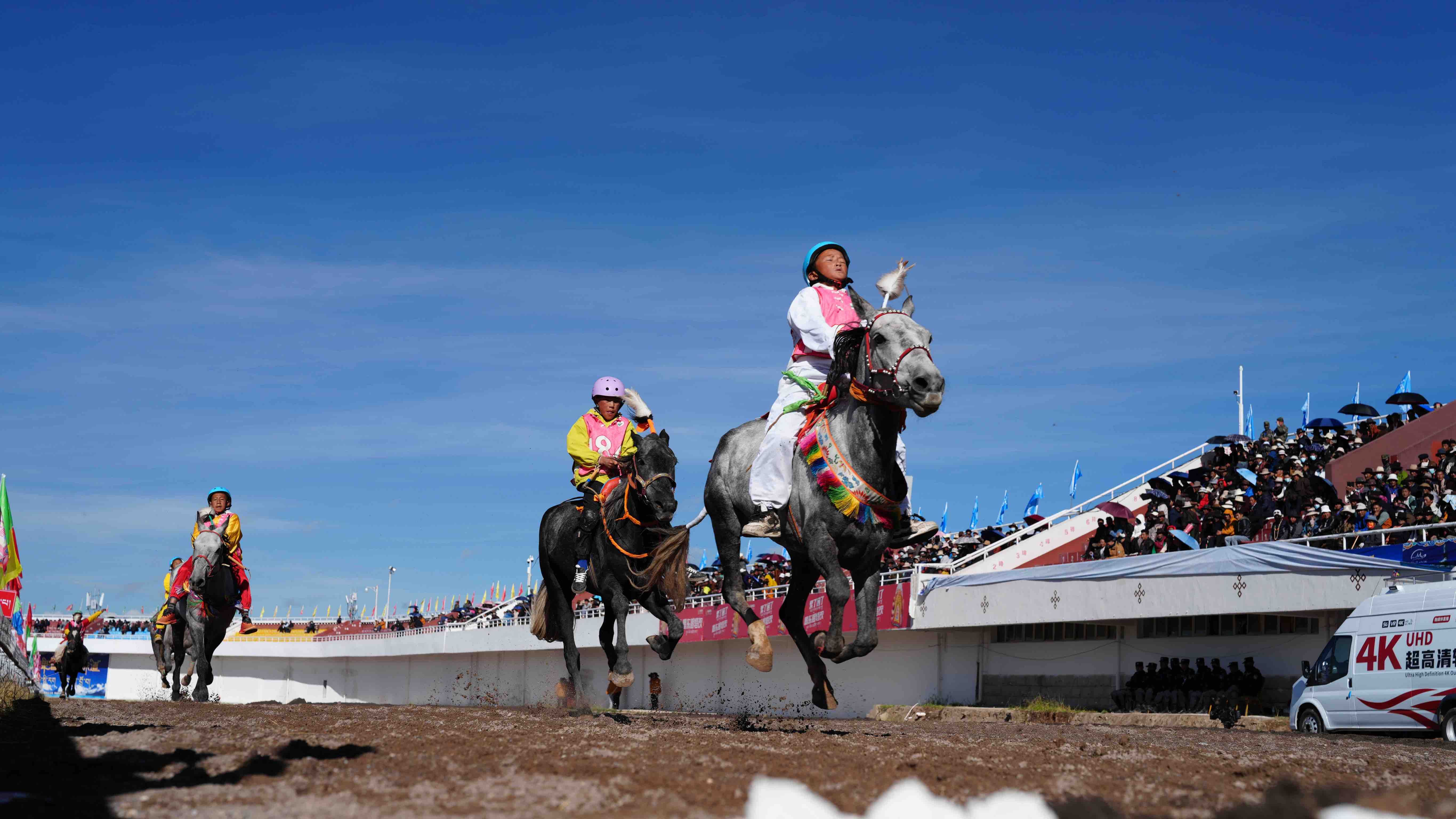 10:00,發(fā)令槍響驟然劃破草原的寧?kù)o,場(chǎng)內(nèi)速跑8000米(1.45米以上超馬)決賽正式拉開戰(zhàn)幕。來自比如縣夏曲鎮(zhèn)165號(hào)騎手與駿馬“玉珠色南”如一道銀色閃電疾馳而過,率先沖線。馬主貢嘎與旺青眼含熱淚望向仍在喘息的愛馬——這是他們?nèi)陙砻咳赵诤0?000米以上高原堅(jiān)持晨訓(xùn)的成果。164號(hào)“玉珠雷電”與196號(hào)“玉馬”分列二三名,賽場(chǎng)上的每一次揮鞭、每一次沖刺,都是對(duì)高原騎手毅力與技藝的極大考驗(yàn)。