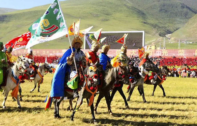 聶榮縣賽馬節(jié)則聚焦“格薩爾文化”,8月12日在聶榮鎮(zhèn)草原上,150名牧民身著格薩爾史詩人物服飾,騎著戰(zhàn)馬演繹“格薩爾王出征”情景劇。騎手們手持仿制的古代兵器,隨著藏鼓與長號的節(jié)奏變換隊形,重現(xiàn)史詩中“賽馬稱王”的經(jīng)典場景?;顒蝇F(xiàn)場,78歲的格薩爾說唱藝人洛桑次仁還即興演唱《格薩爾·羌塘分章》,歌聲與馬蹄聲交織,讓古老傳說在草原上鮮活起來。